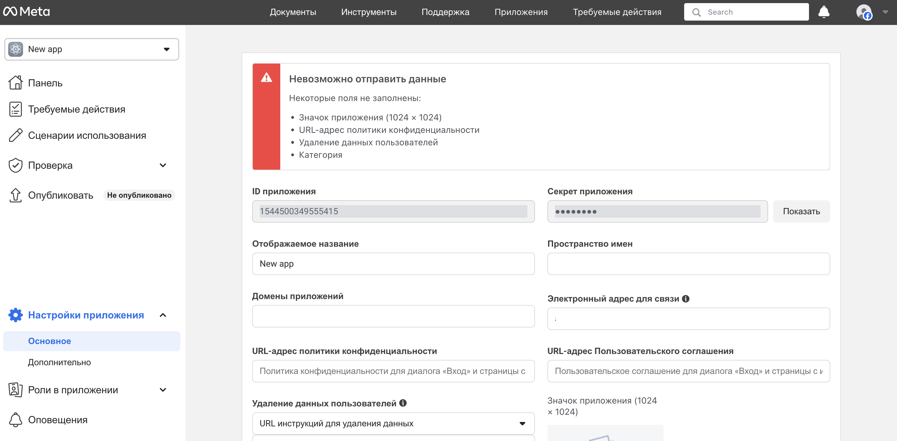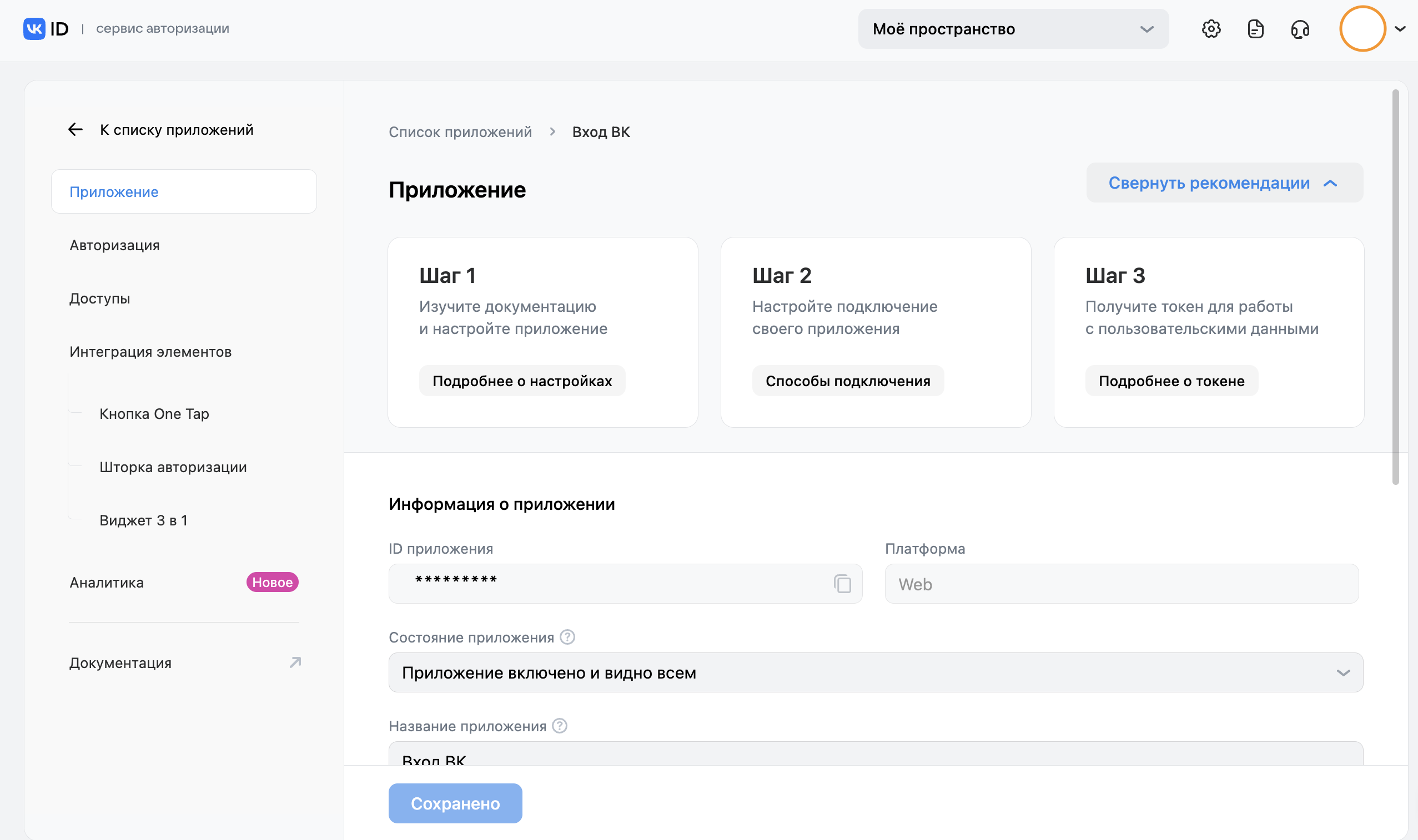 После заполнения всех настроек нажмите Создать приложение. Ваше приложение будет активировано.