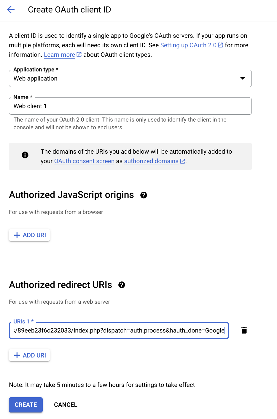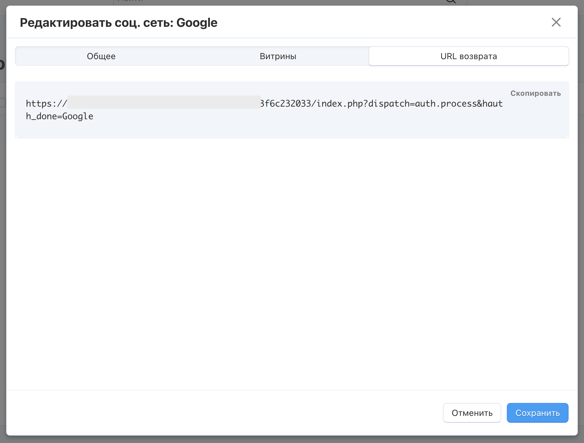 На этом шаге скопируйте ссылку из настроек провайдера Google на стороне CS-Cart (Настройки → Вход через соц. сети → URL возврата в настройках соц. сети) и вставьте её как Разрешённый URI перенаправления (Authorized redirect URIs) на стороне Google.
