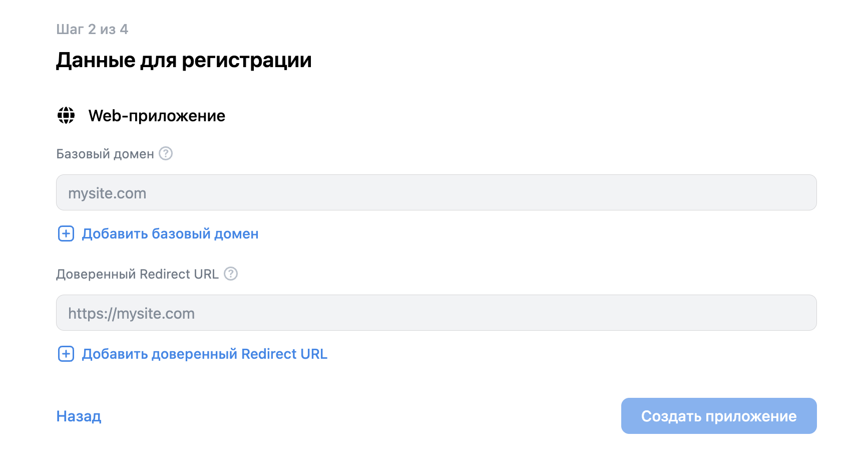 На странице шага 2, нужно будет указать Базовый домен и Доверенный Redirect URL, это нужно для исправной работы VK. Базовый домен — это домен вашего сайта, например, store.ru. Если вы хотите использовать поддомен, то перед базовым доменом нужно поставить точку ”.”, например, .store.ru. Доверенный Redirect URL — тот адрес, куда будут перенаправлены ваши пользователи после успешной авторизации. Здесь нужно указывать полный адрес страницы, например, адрес домашней страницы CS-Cart включает