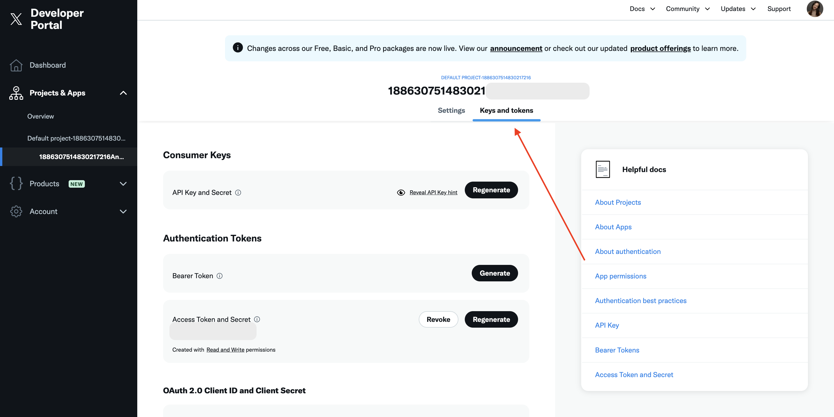 - Теперь перейдите во вкладку Keys and tockens.