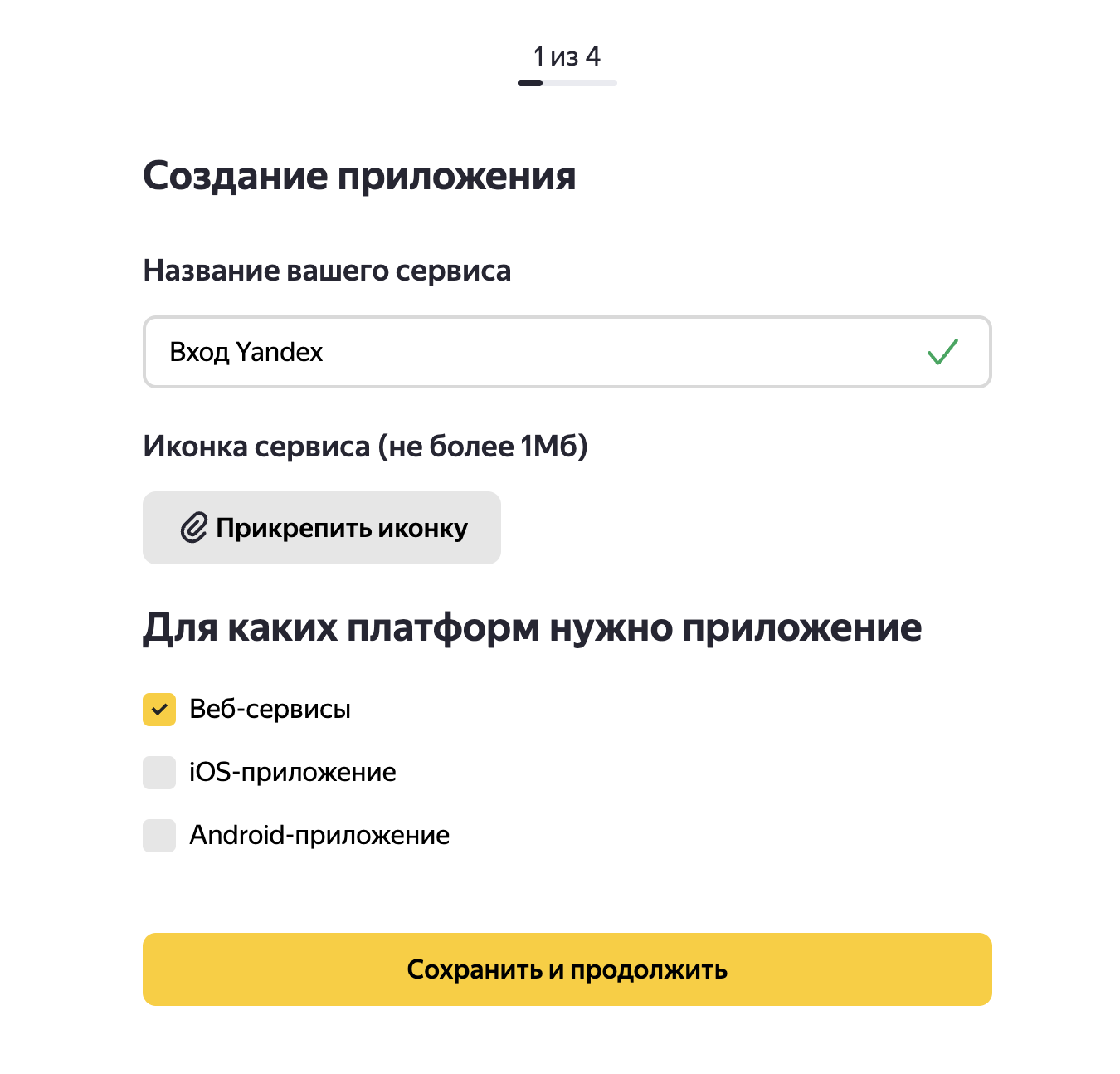 Выполните настройку нового приложения: