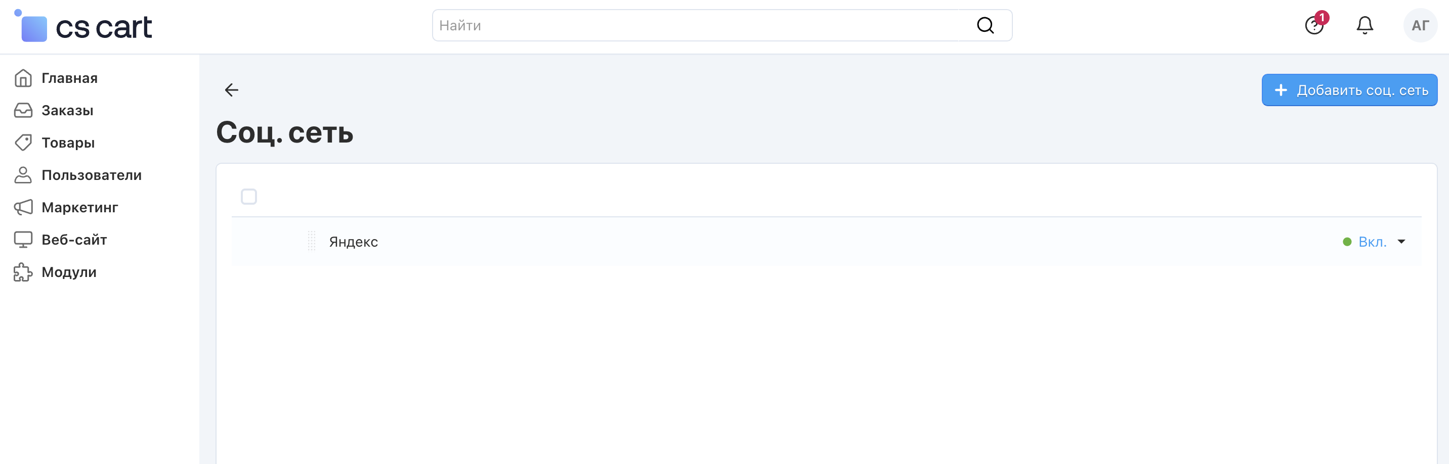 Установите модуль «Вход через соцсети» в панели администратора, а также “Вход через соцсети: российские социальные сети”, чтобы подключить российские социальные сети.