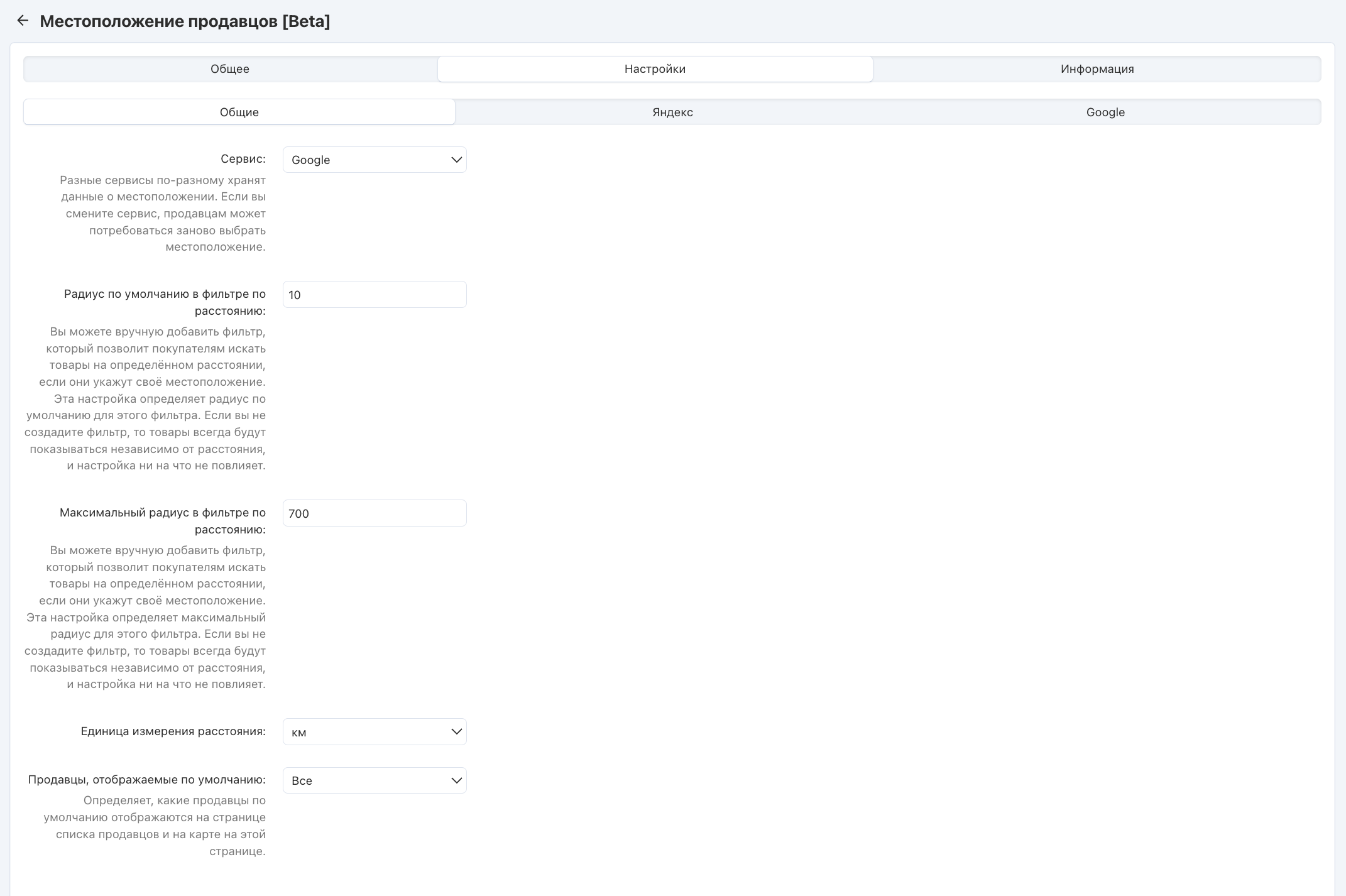 Сервис определяет, какой провайдер карт и геолокации будет использоваться в вашем магазине. После выбора сервиса вы можете перейти во вкладки настроек каждого из них: