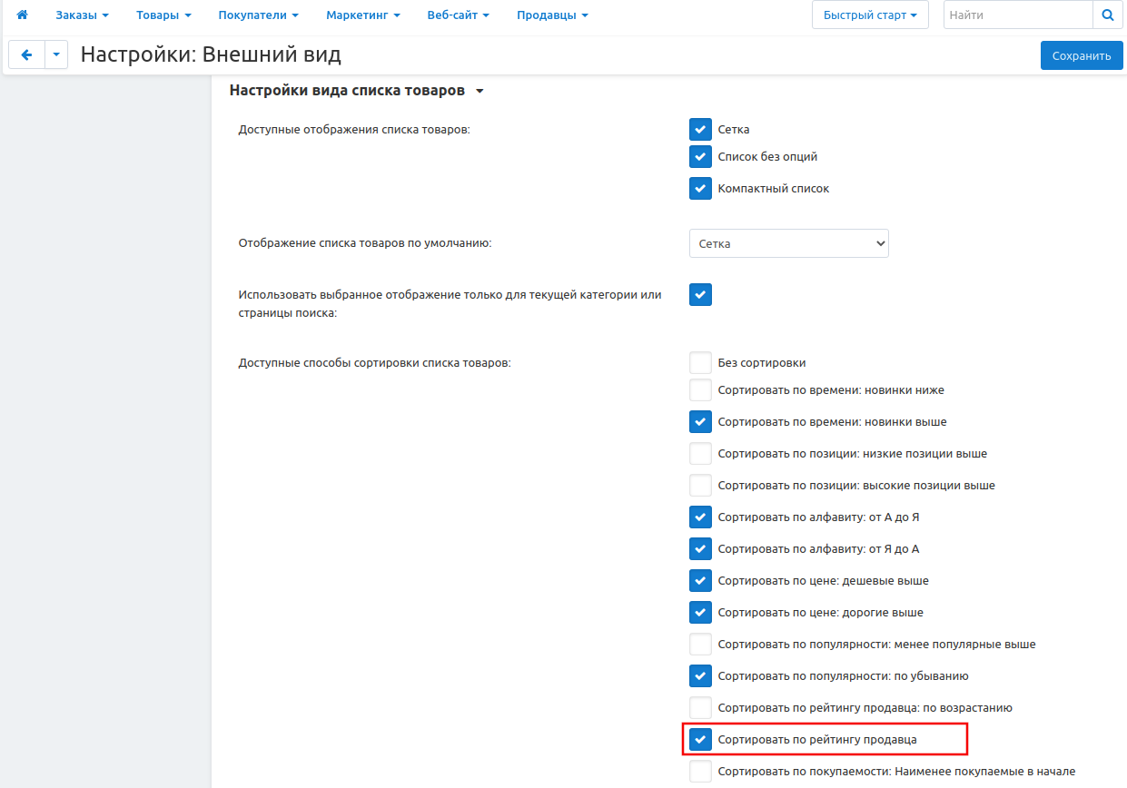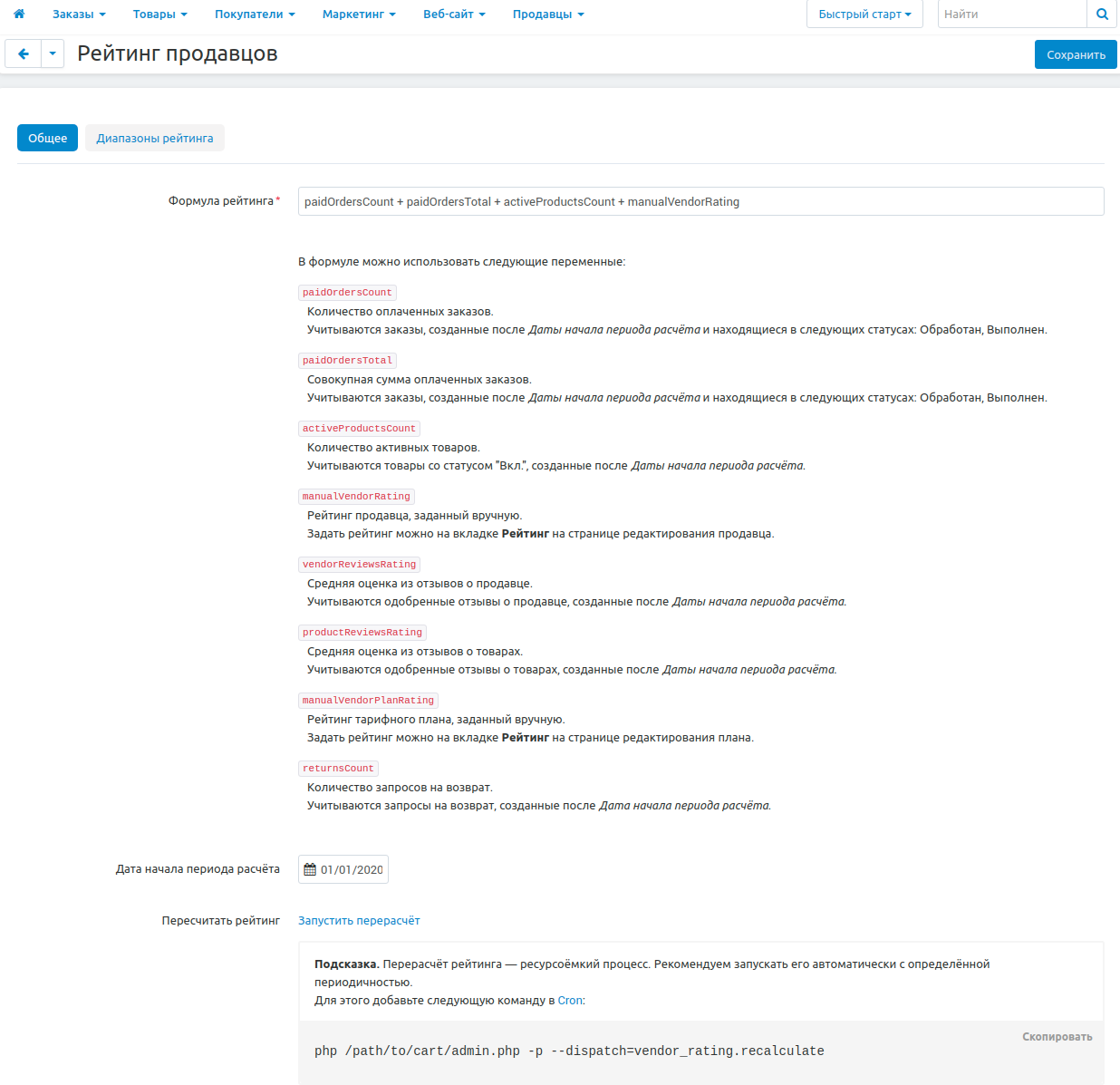 paidOrdersCount— количество заказов продавца со статусом Обработан и Выполнен.paidOrdersTotal— сумма заказов продавца со статусом Обработан и Выполнен.activeProductsCount— количество активных товаров продавца со статусом Вкл..manualVendorRating— рейтинг продавца, заданный вручную. Перейдите на вкладку Рейтинг на странице Продавцы → Продавцы, чтобы ввести этот показатель. Допустимое значение показателя — от 0 до 100.vendorReviewsRating— средняя оценка из одобренных отзывов о продавце.productReviewsRating— средняя оценка из одобренных отзывов о товарах.manualVendorPlanRating— рейтинг тарифного плана, заданный вручную. Перейдите на страницу Продавцы → Тарифные планы для продавцов. Щёлкните по названию тарифного плана, чтобы открыть его настройки, и перейдите на вкладку Рейтинг. Укажите значение рейтинга. Допустимое значение показателя — от 0 до 100.