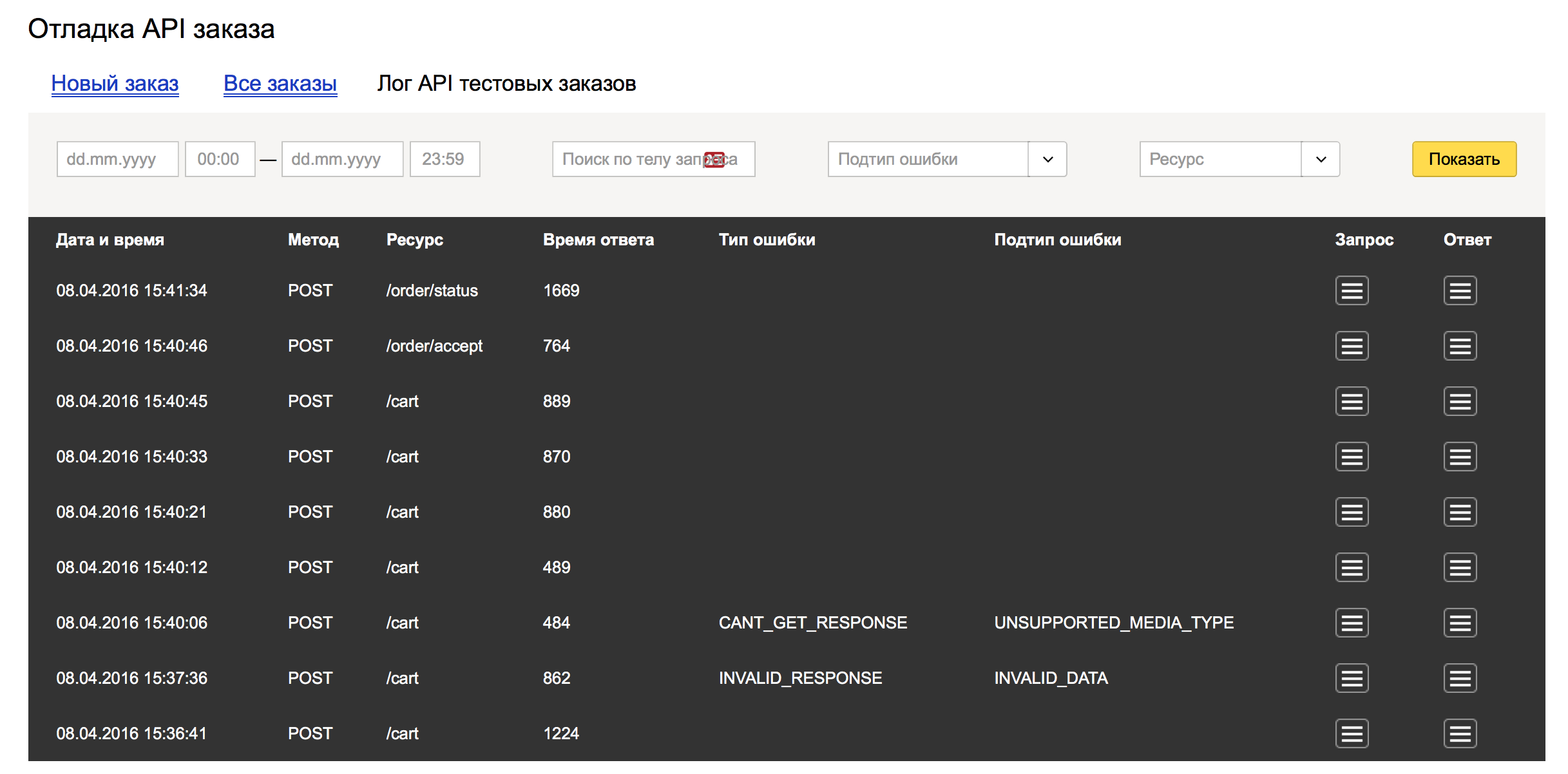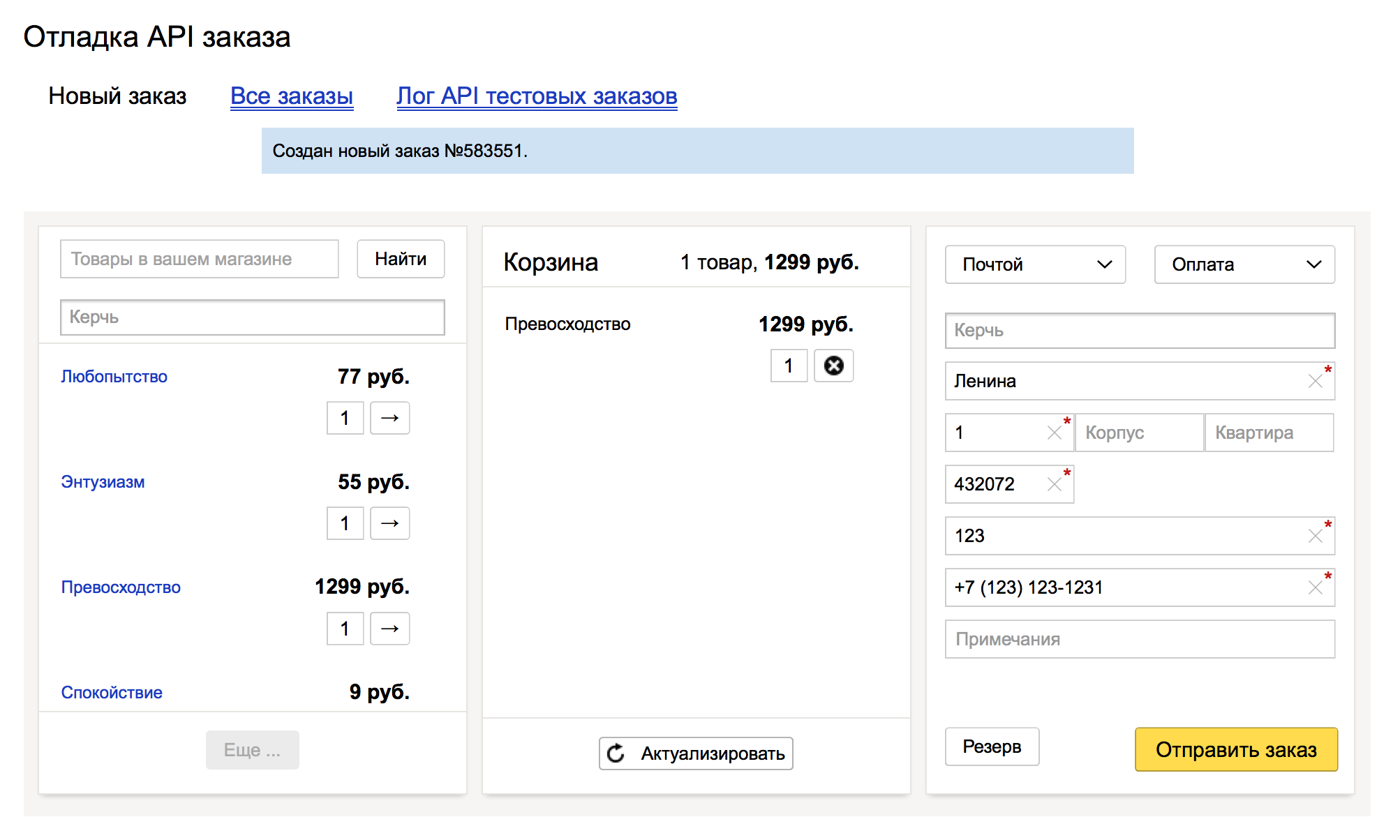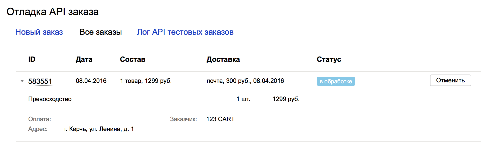 Если возникают ошибки, то их можно разобрать на вкладке “Лог API тестовых заказов”