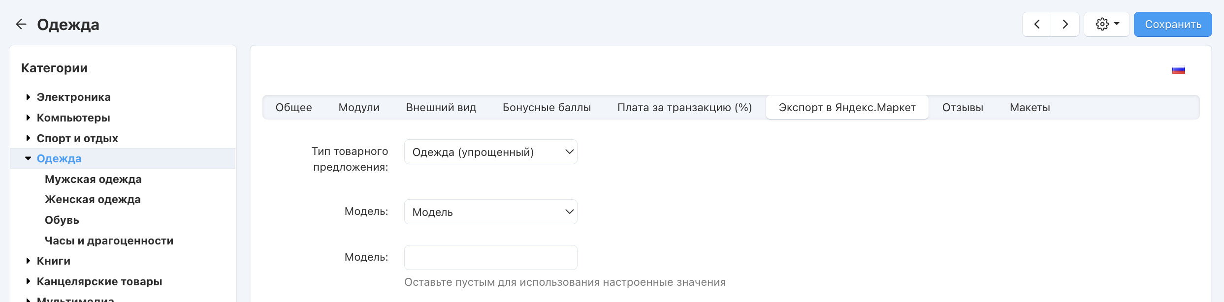 Для выгрузки товарных предложений, относящихся к категории Одежда, обувь и аксессуары, необходимо в настройках категорий выбрать Тип товарного предложения либо Одежда (упрощенный), либо Одежда (произвольный).