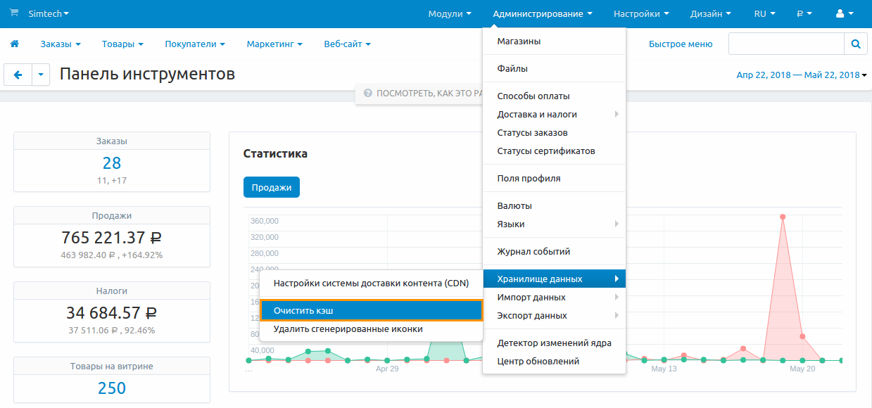 Если после установки модуля изменений нет, очистите кэш вашего магазина. В панели администратора откройте Администрирование → Хранилище данных и нажмите кнопку Очистить кэш.