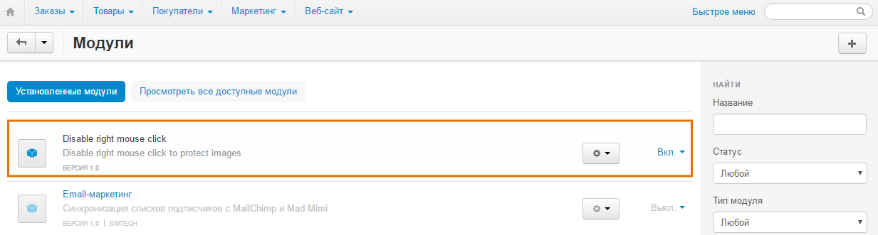 Отключим щелчок правой кнопкой мыши на сайте, чтобы защитить изображения от копирования. Для этого воспользуемся модулем Disable Right Mouse Click.