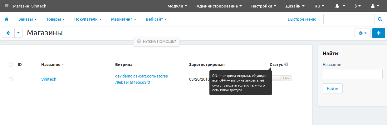 Если у вас единственная витрина, то цвет верхнего меню в панели администратора изменится. Когда витрин много, то цвет изменится только тогда, когда вы переключаетесь на закрытую витрину и работаете с ней. Так проще понять, что выбранная витрина закрыта.
