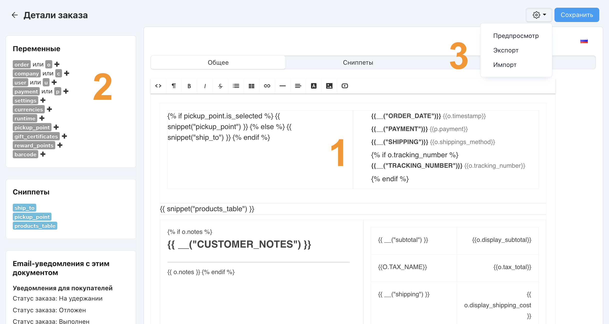 {{__("tracking_number")}}, в готовый документ будет добавлен текст “Номер отслеживания”. Этот текст хранится в языковой переменнойtracking_number.Сниппеты представляют собой готовые элементы документов. Сниппеты используются, если нужно добавить сложную логику в шаблон, не перегружая при этом код шаблона в редакторе. У каждого документа свой собственный набор сниппетов.