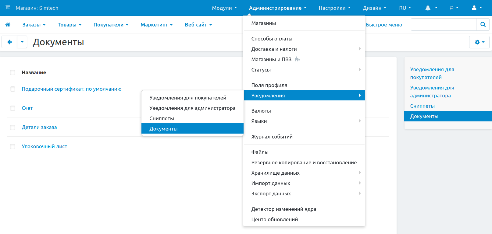 В редактор включён список типов документов, которые используются в магазине. Обратите внимание, что модули сторонних разработчиков могут добавлять другие типы документов. Эти новые документы могут отображаться или не отображаться в списке.