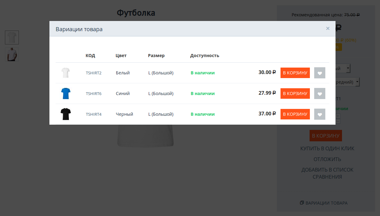 В CS-Cart есть возможность показать все существующие вариации товара на странице этого товара. Если раньше требовалось открыть страницу товара, а затем перебирать варианты опций, чтобы найти нужные и увидеть, есть ли они в наличии, то теперь покупатель сможет: