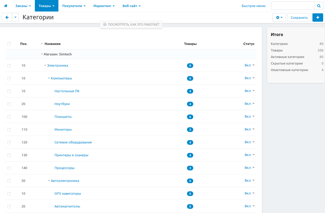 Администраторы могут выполнять на странице Товары → Категории следующие действия: