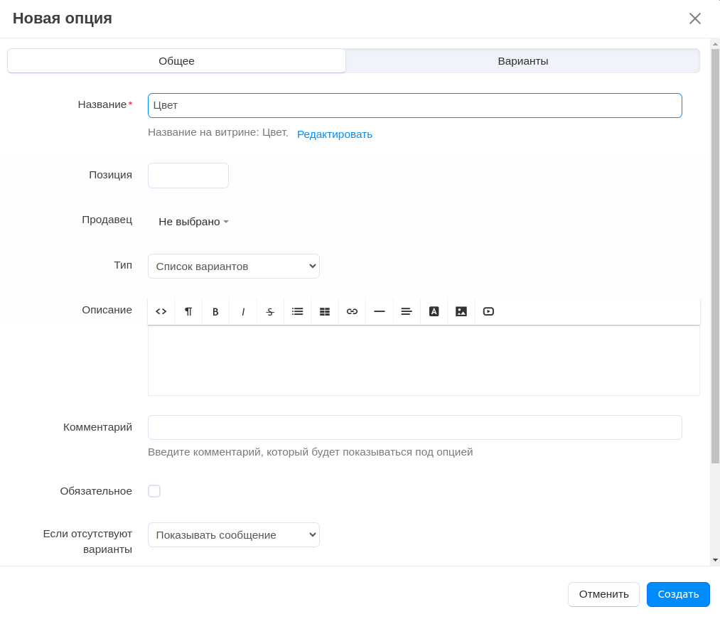 Начните вводить название опции. Если такой опции не существует в вашем магазине, нажмите Добавить.