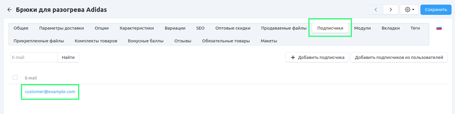 Чтобы увидеть подписчиков на конкретный товар, откройте страницу Товары → Товары, нажмите на название нужного товара и перейдите на вкладку Подписчики.