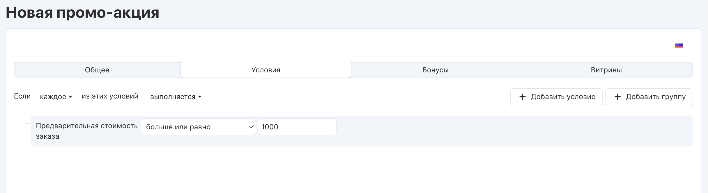 Выберите в выпадающем списке условие Предварительная стоимость заказа с вариантом больше или равно и введите желаемую сумму.