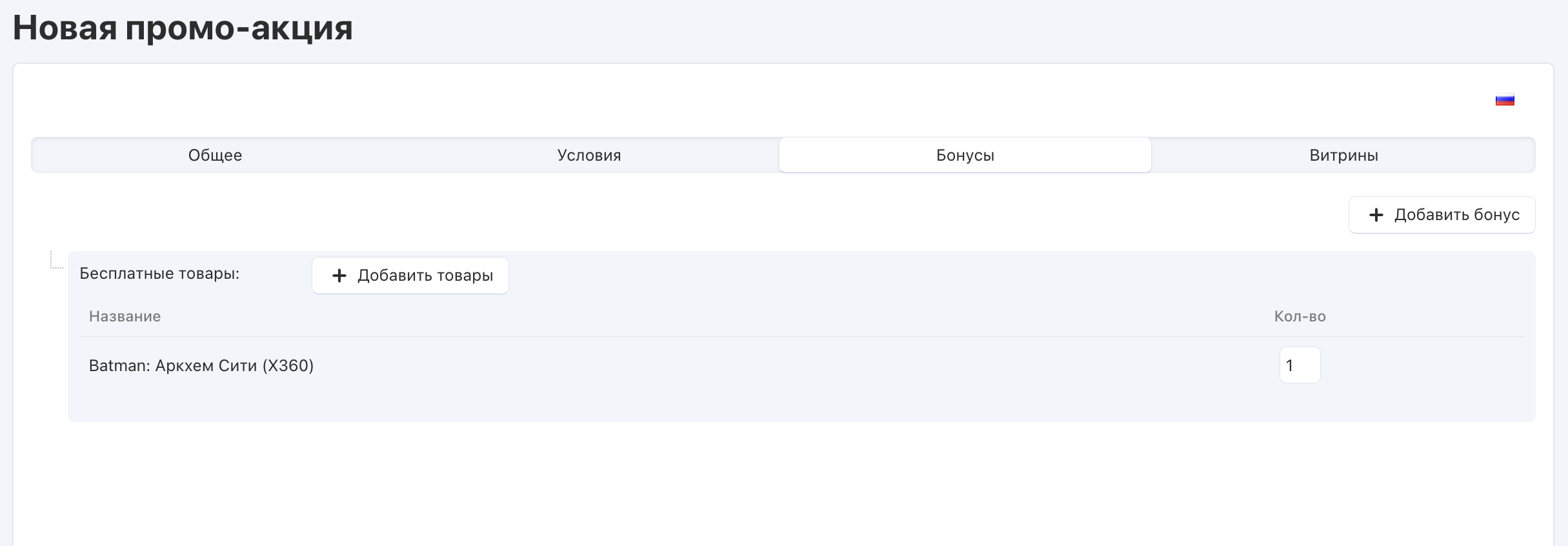 Выберите из выпадающего списка бонус Бесплатные товары нажмите кнопку Добавить товары.