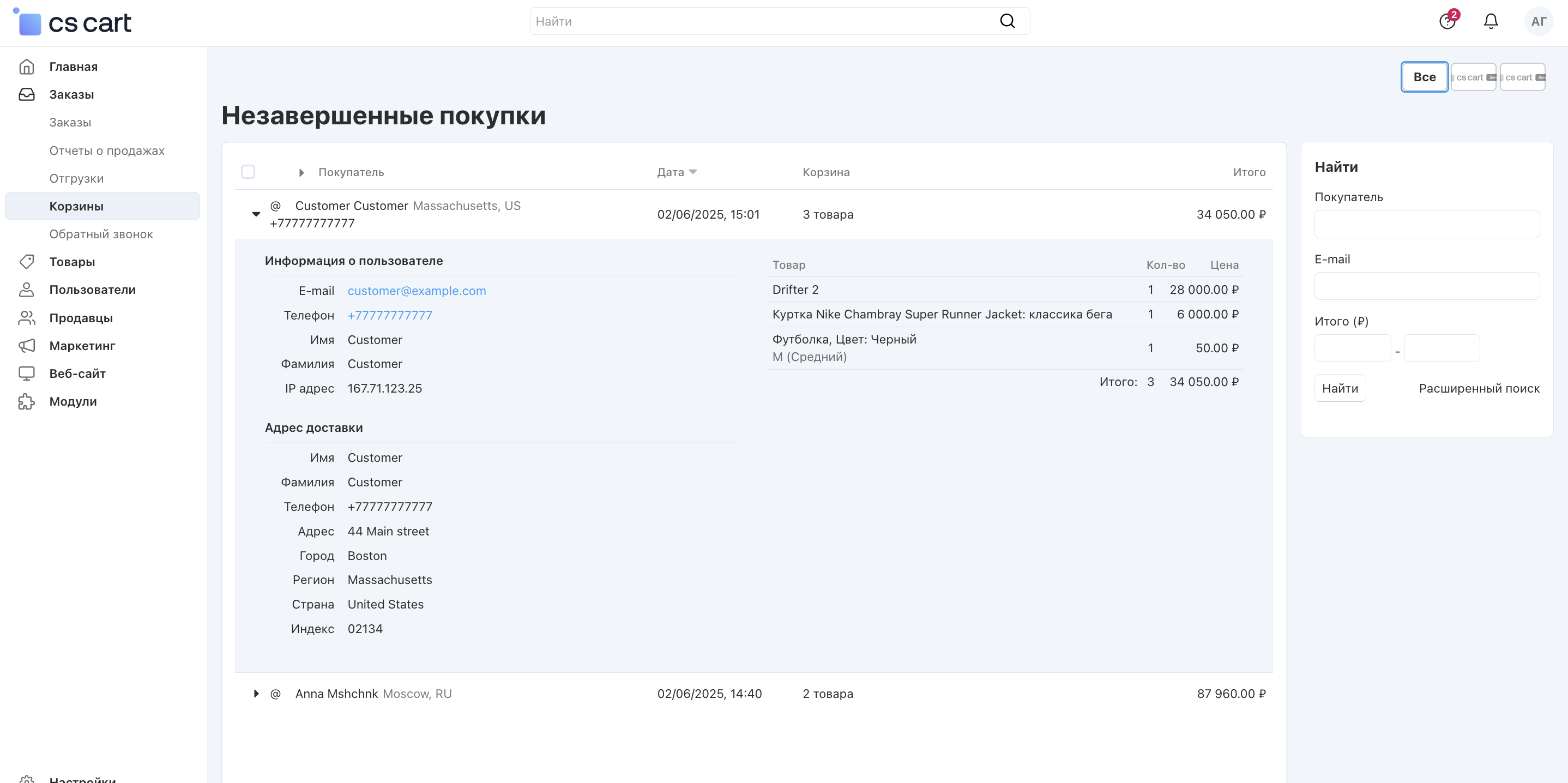 На странице Заказы → Корзины находится информация о том, какие товары находятся в корзине или в списке отложенных товаров у конкретных пользователей, но которые ещё не куплены. Когда зарегистрированный пользователь уходит с сайта магазина, а затем возвращается, то товары, которые были в корзине, но не были куплены, снова возвращаются в корзину.