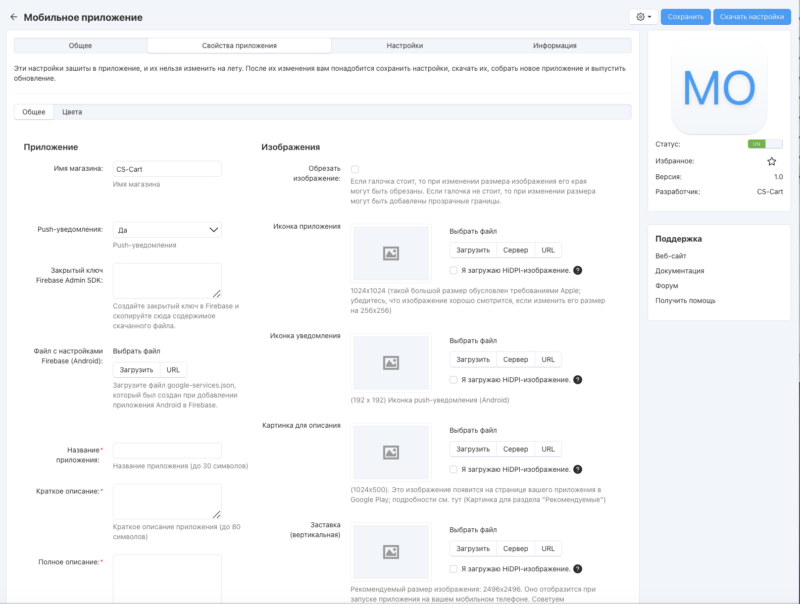 Большую часть этих данных нужно предоставить нам через модуль Мобильное приложение (вместе с цветами будущего приложения):