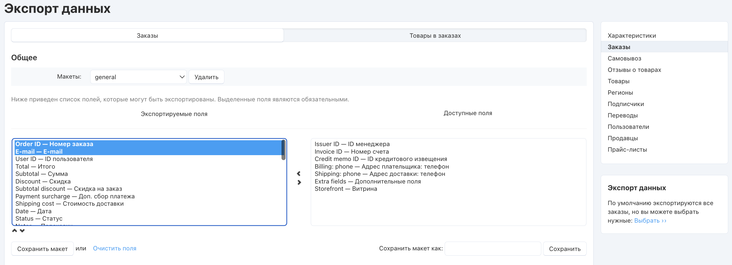 Если вы регулярно экспортируете какие-то данные, то вы можете сохранить список экспортируемых полей. Для этого введите название в поле Сохранить макет как и нажмите кнопку Сохранить. После этого вы сможете выбрать макет в выпадающем списке.