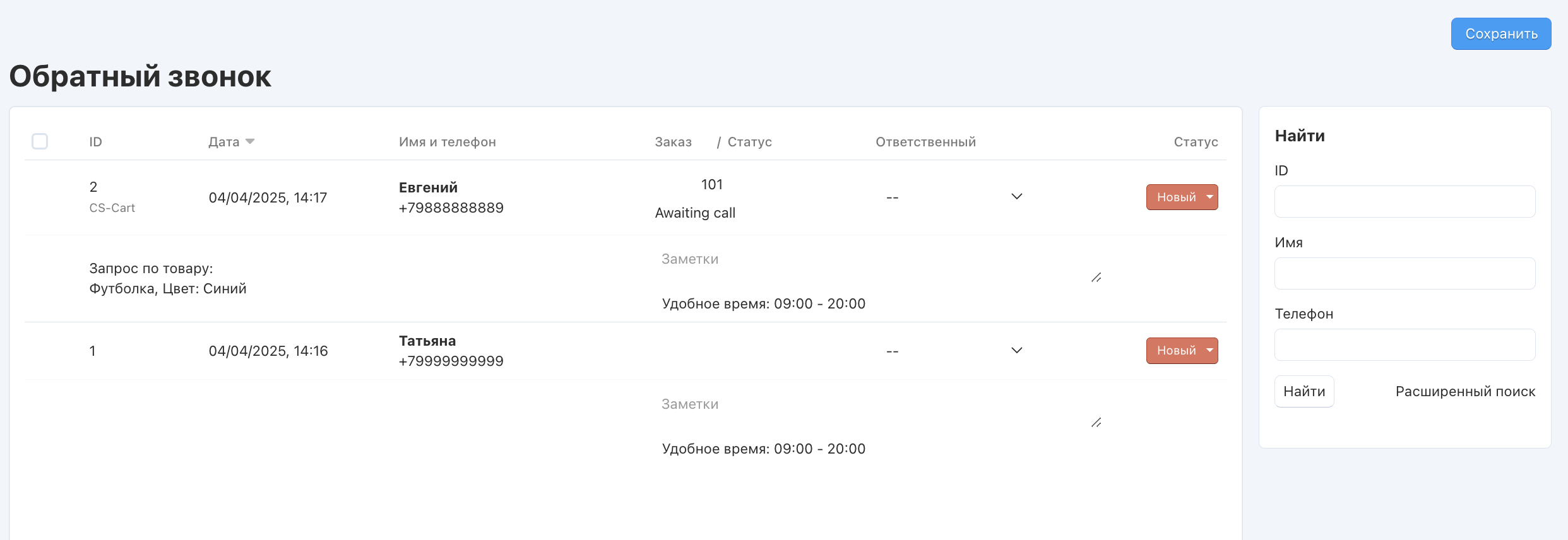 На странице Заказы → Обратный звонок у каждой заявки есть следующая информация: