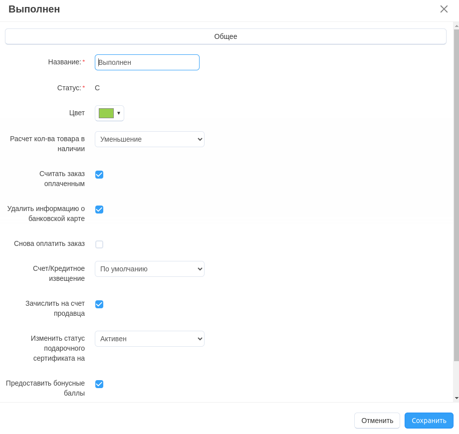 Предоставлять бонусные баллы — поставьте галочку, если хотите предоставлять покупателю бонусные баллы, когда заказ получает этот статус.