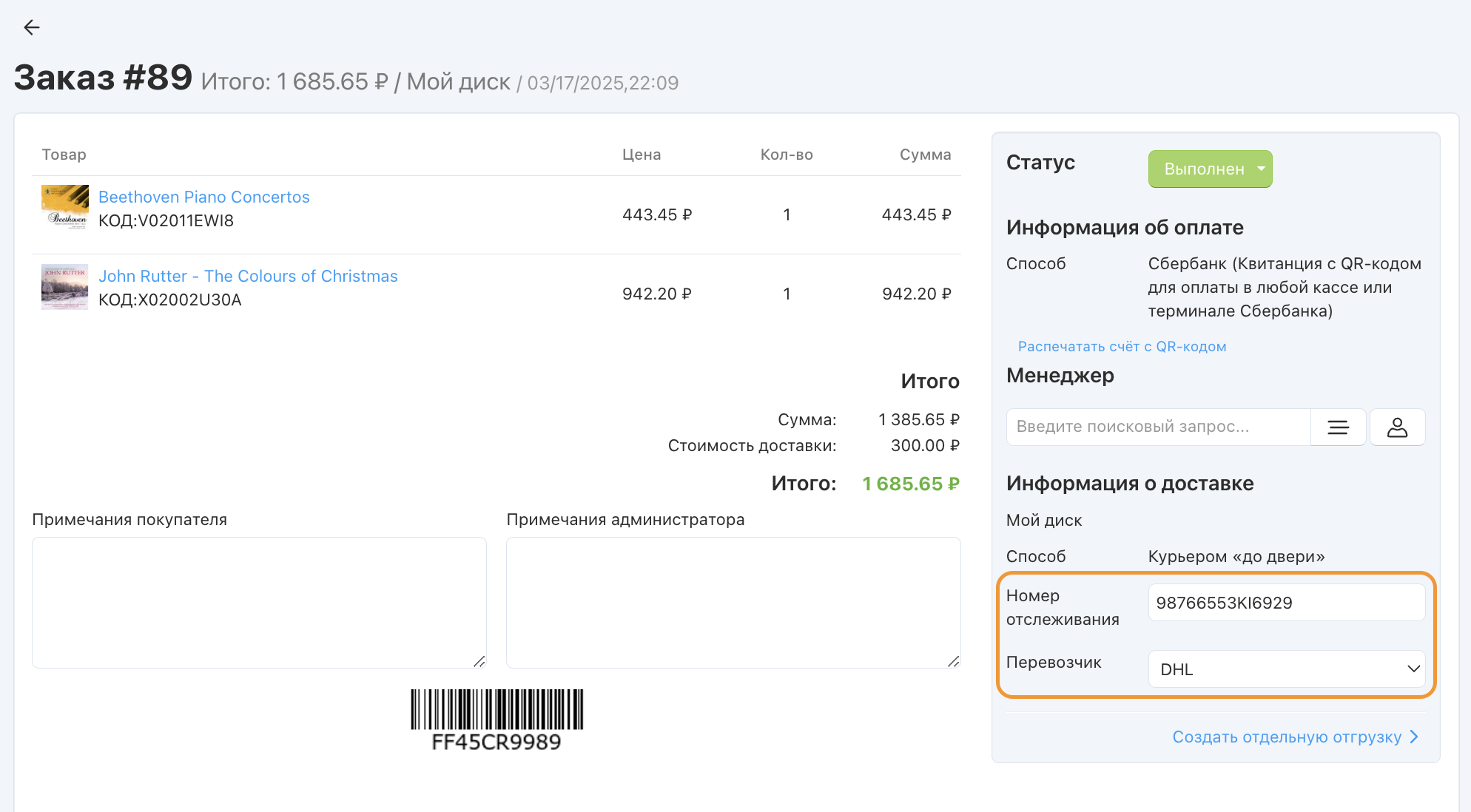Если вы оставите поля Номер отслеживания и Перевозчик пустыми, то отгрузка не будет создана.