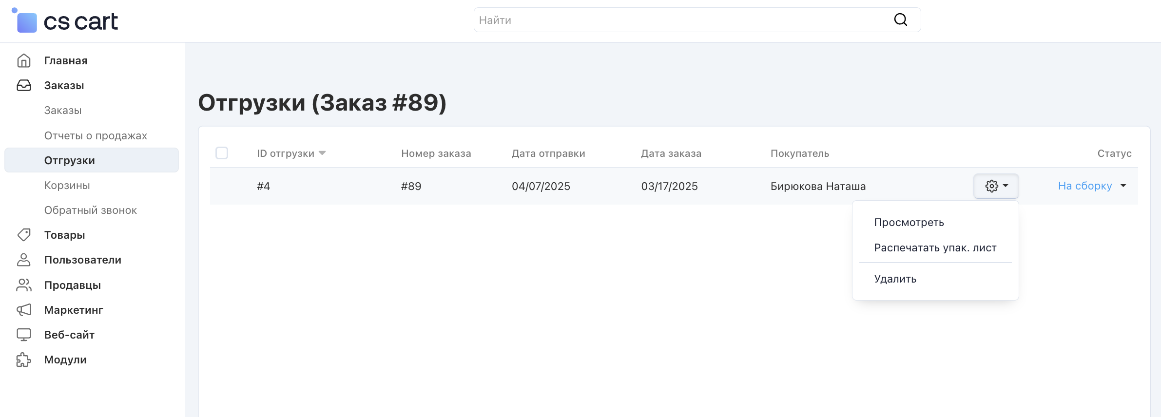 CS-Cart позволяет разбивать товары в заказе на разные партии и отправлять их покупателям по отдельности. Эти партии называются отгрузками и позволяют облегчить работу с заказами, где есть товары, которых ещё нет в наличии.