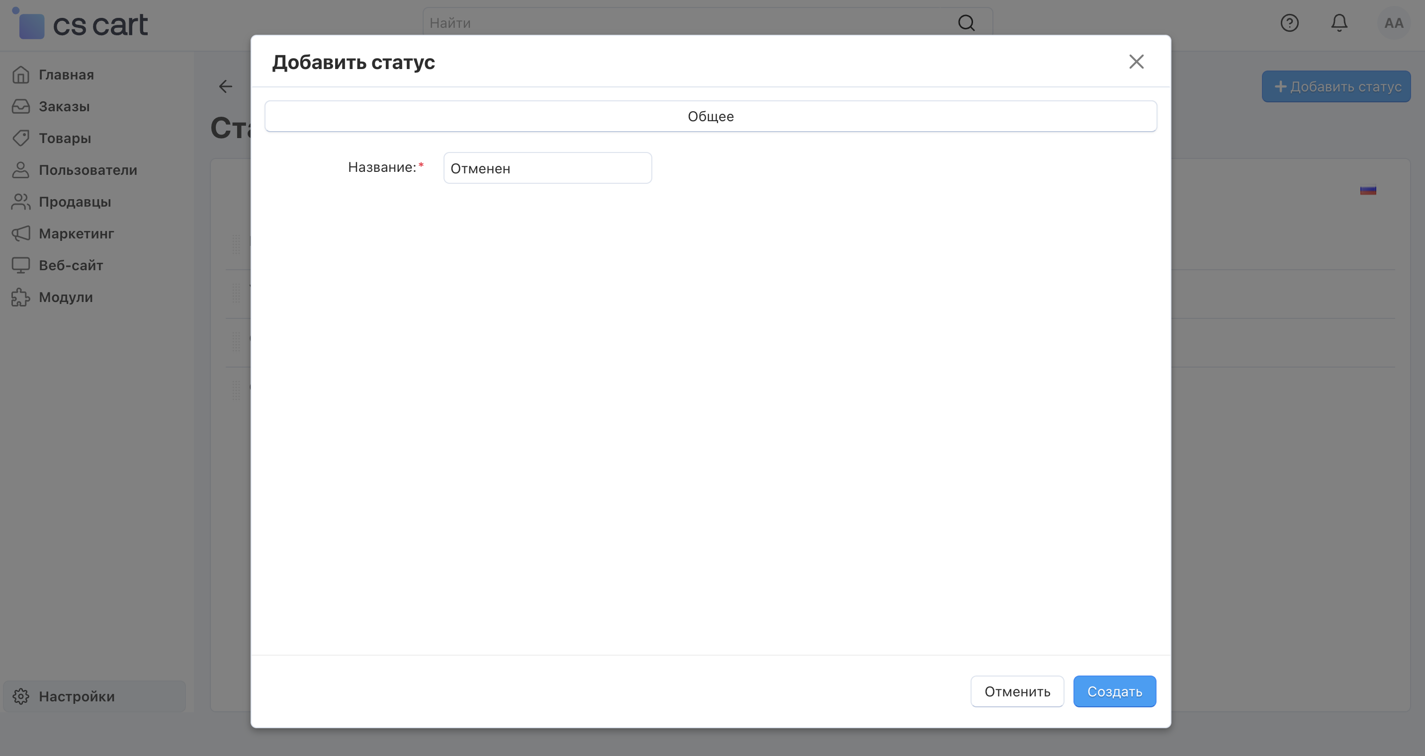 Назовите новый статус и нажмите кнопку Создать. После этого вы сможете выбрать этот статус на списке отгрузок.