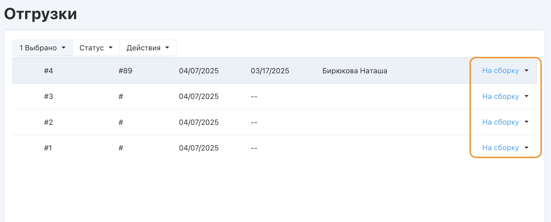 На странице Заказы → Отгрузки находится список всех отгрузок в вашем магазине. У отгрузок есть статусы, которые помогают отсортировать список или найти нужные отгрузки. По умолчанию существует 3 статуса: На сборку, Упакован и Отправлен. Вы можете редактировать эти статусы или добавлять свои собственные.