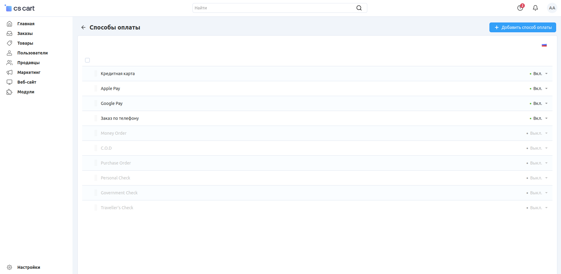 В CS-Cart доступна гибкая настройка каждого способа оплаты. Вы можете подключить ваш интернет-магазин к популярным системам онлайн-оплаты или создать ручные способы оплаты. Каждый способ оплаты в CS-Cart может иметь индивидуальную надбавку к сумме заказа, название, инструкцию, логотип и другие настройки, которые настраиваются из панели администратора.