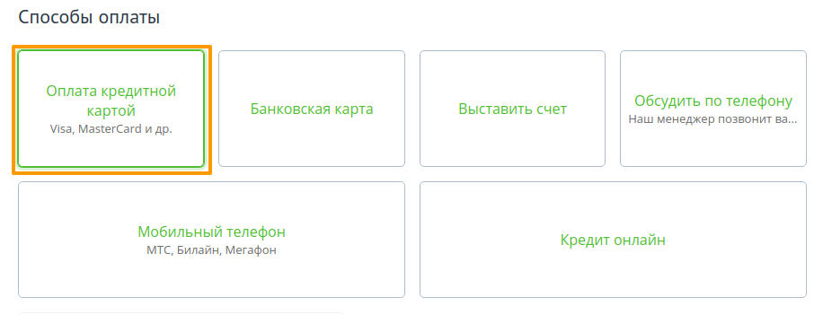| Ручные | Заказ создаётся без проведения платежа. Администратор интернет-магазина связывается с покупателем для обсуждения оплаты. Например: Обсудить по телефону или Выставить счёт |