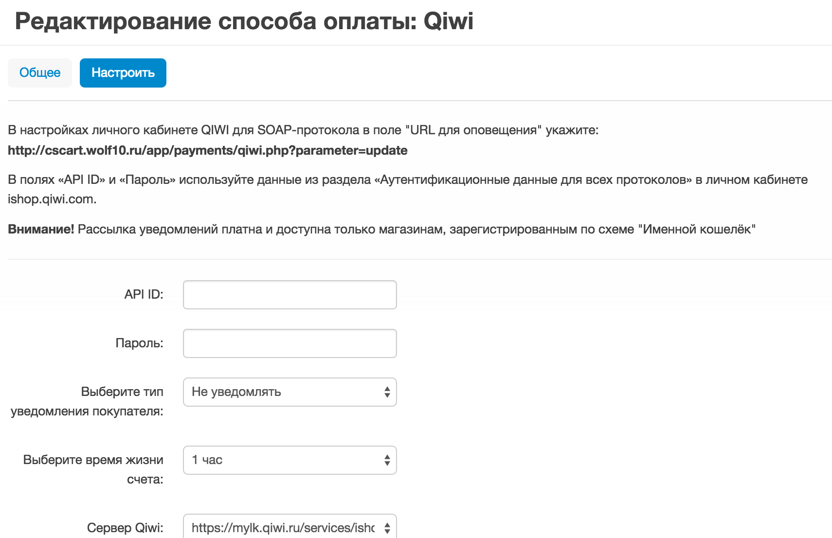 http://cscart.wolf10.ru/app/payments/qiwi.php?parameter=updateДля “Тип уведомлений” выберите “SoapNotifyType.MD5 - простая подпись”