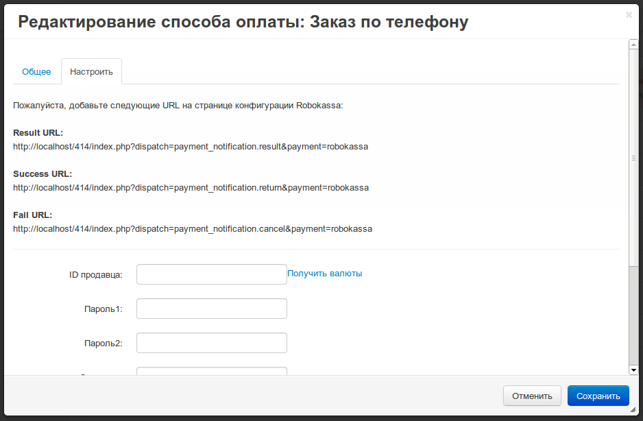 Чтобы получить список доступных способов оплаты, введите настройку “ID продавца” и нажмите ссылку “Получить валюты” рядом с настройкой “ID продавца”