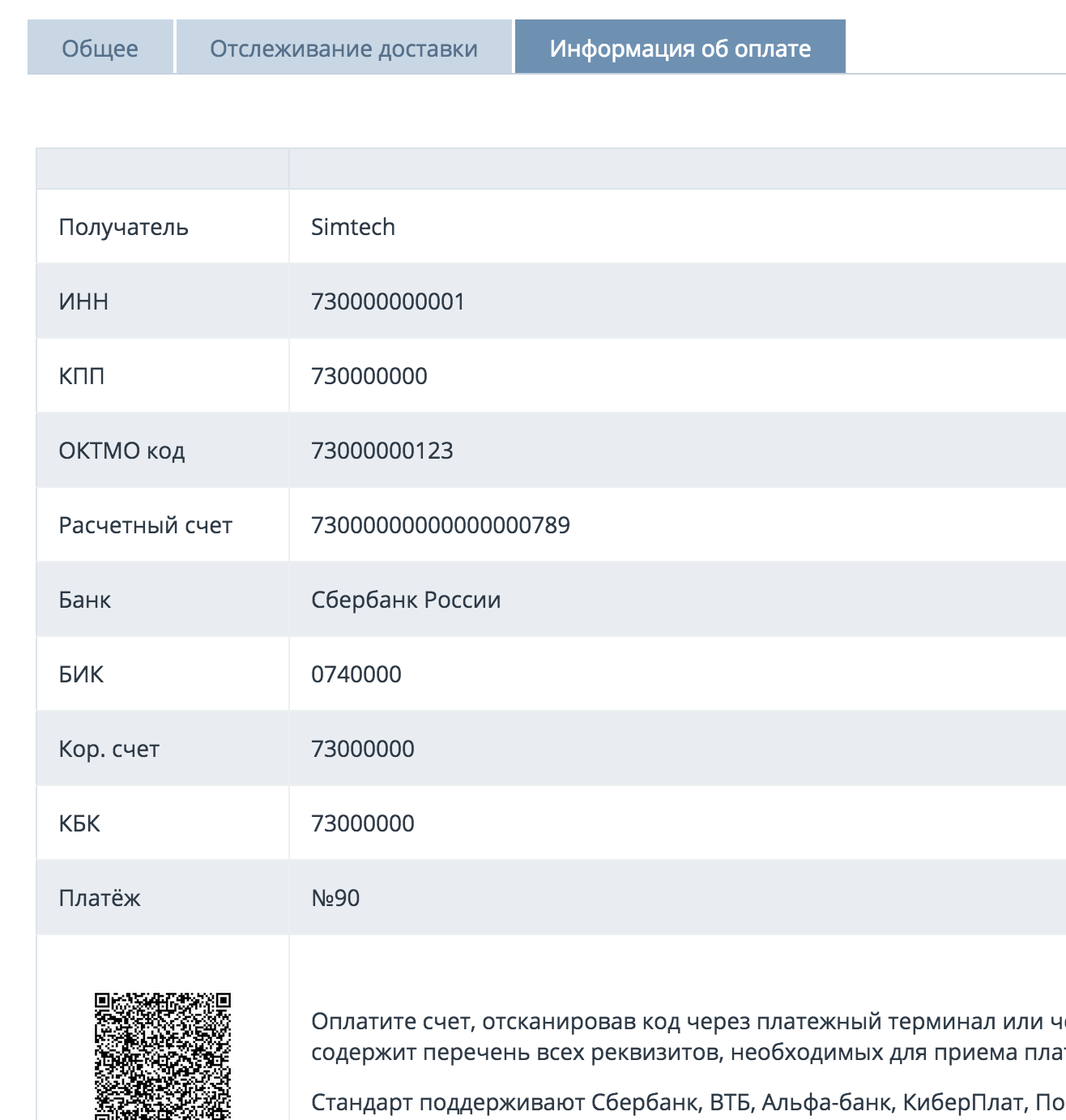 Вкладка “Платёжная информация” содержит банковские данные компании для оплаты заказа.