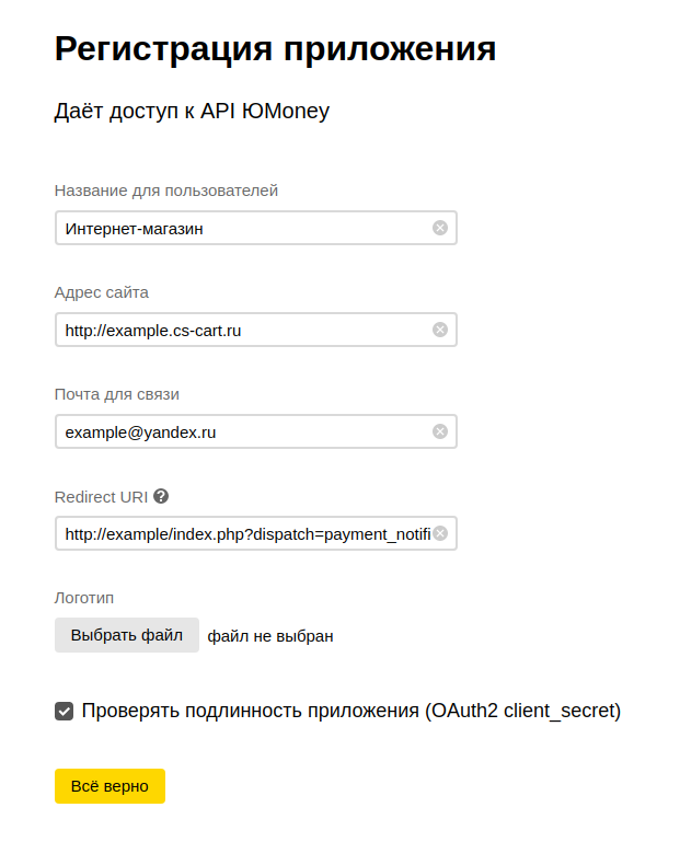 Название вашего приложения Название вашего приложения, например «Интернет-магазин». Адрес сайта URL интернет-магазина Почта для связи Адрес электронной почты Redirect URI http://ваш_домен/index.php?dispatch=payment_notification.process&payment=yandex_p2pИспользовать проверку подлинности приложения Да Нажмите “Подтвердить”.