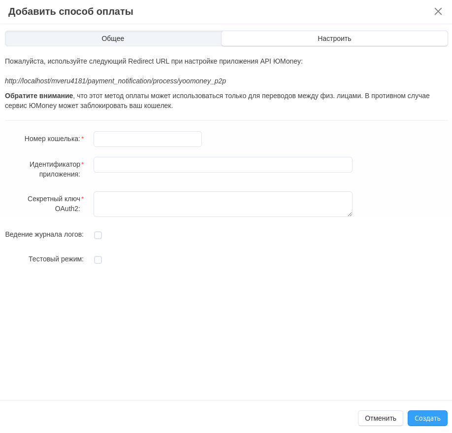В окне создания способа оплаты выберите процессор ЮMoney: Перевод на счёт.