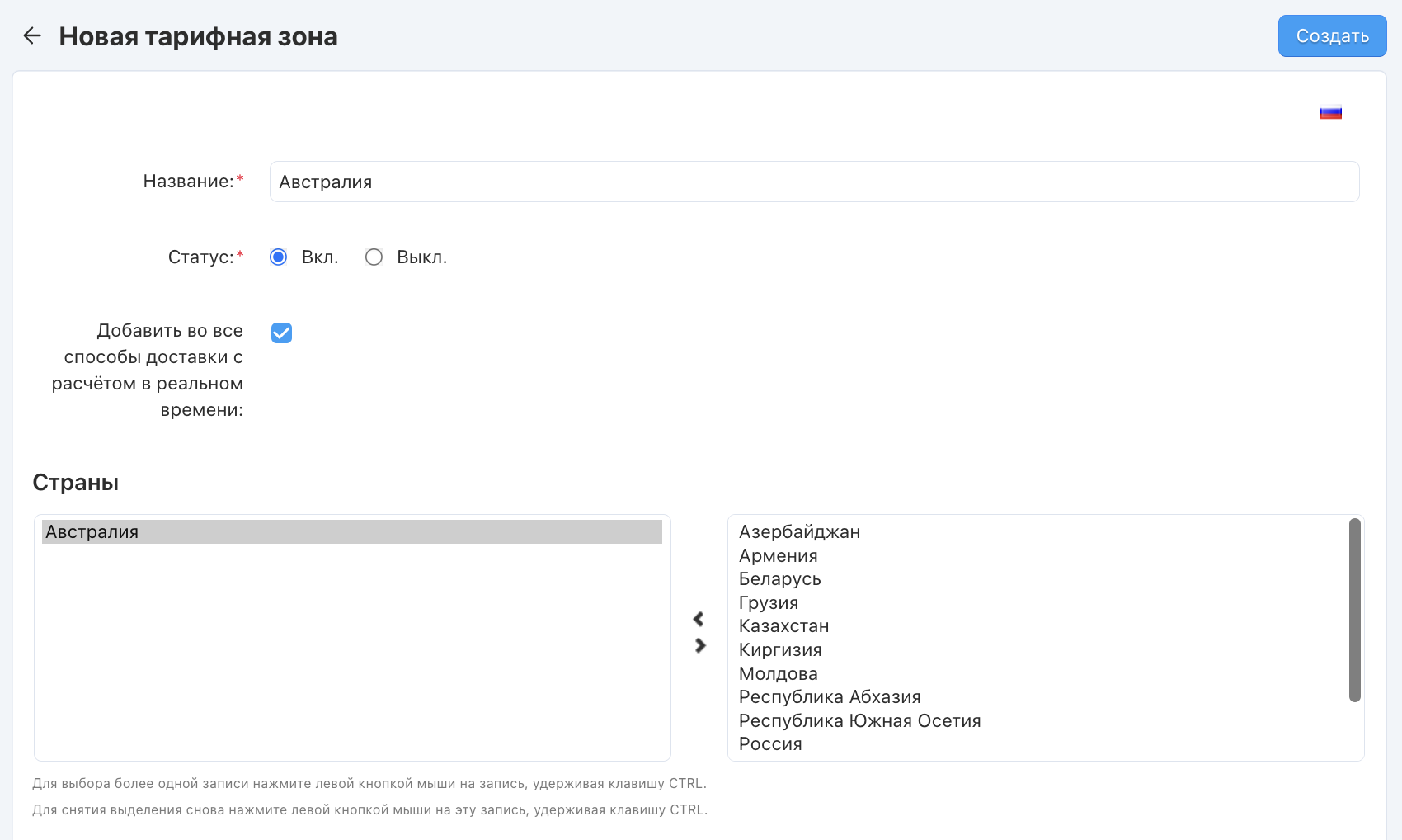 Поставьте галочку Добавить во все способы доставки с расчётом в реальном времени, если хотите, чтобы новая тарифная зона автоматически добавилась во все способы доставки с расчётом тарифа в реальном времени.