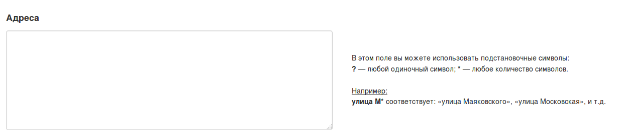 В текстовом поле находятся адреса, которые относятся к тарифной зоне. Каждый новый адрес должен начинаться со следующей строки. Не обязательно указывать адреса целиком, можно воспользоваться символами обобщения. Вот как они работают: