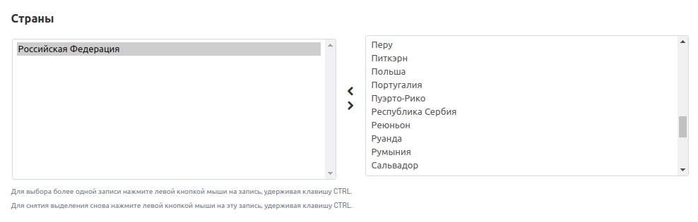 В правом списке находятся доступные страны, а в левом списке находятся страны, которые относятся к тарифной зоне. Чтобы перемещать страны между списками, воспользуйтесь горизонтальными стрелками между ними. Чтобы выбрать несколько стран, нажмите и удерживайте клавишу Ctrl или Shift при выборе.
