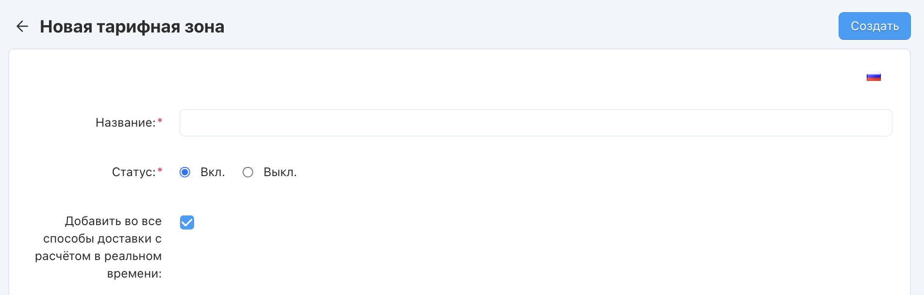 Добавить во все способы доставки с расчётом в реальном времени — поставьте галочку, если хотите, чтобы после создания тарифная зона добавилась во все существующие в магазине способы доставки с расчётом тарифа в реальном времени (доступно только при создании новой тарифной зоны).