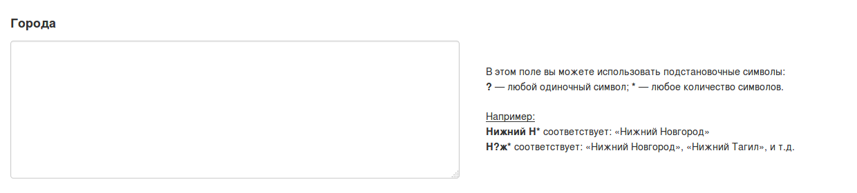 В текстовом поле находятся города, которые относятся к тарифной зоне. Каждый новый город должен начинаться со следующей строки. Не обязательно указывать названия городов целиком, можно воспользоваться символами обобщения. Вот как они работают: