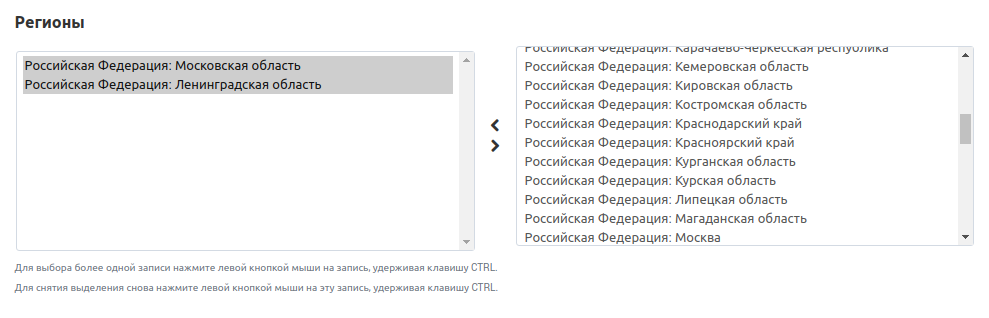 В правом списке находятся доступные регионы, а в левом списке находятся регионы, которые относятся к тарифной зоне. Чтобы перемещать регионы между списками, воспользуйтесь горизонтальными стрелками между ними. Чтобы выбрать несколько регионов, нажмите и удерживайте клавишу Ctrl или Shift при выборе.