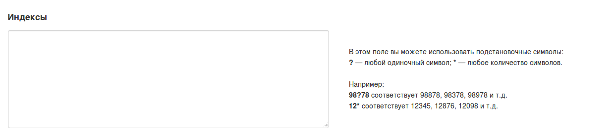 В текстовом поле находятся индексы, которые относятся к тарифной зоне. Каждый новый индекс должен начинаться со следующей строки. Не обязательно указывать индексы целиком, можно воспользоваться символами обобщения. Вот как они работают: