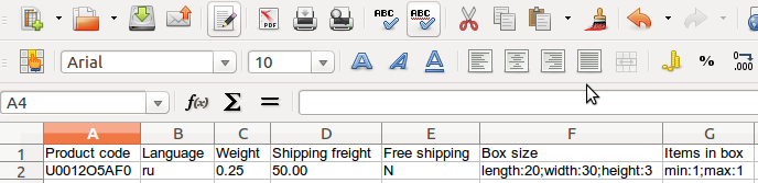 Поле импорта/экспорта Описание Значение поля Product code Обязательное поле, необходимо для идентификации товара. Код обновляемого товара Language Язык. Обязательное поле. ru,enи т.д.Weight Вес одной единицы товара. 0.25Shipping freight Стоимость доставки одной единицы товара. 50.00Free shipping Определяет, может ли этот товар доставляться бесплатно. NилиYBox size Размеры коробки. length:20;width:30;height:3Items in box Количество штук в коробке. min:1;max:1Примечание