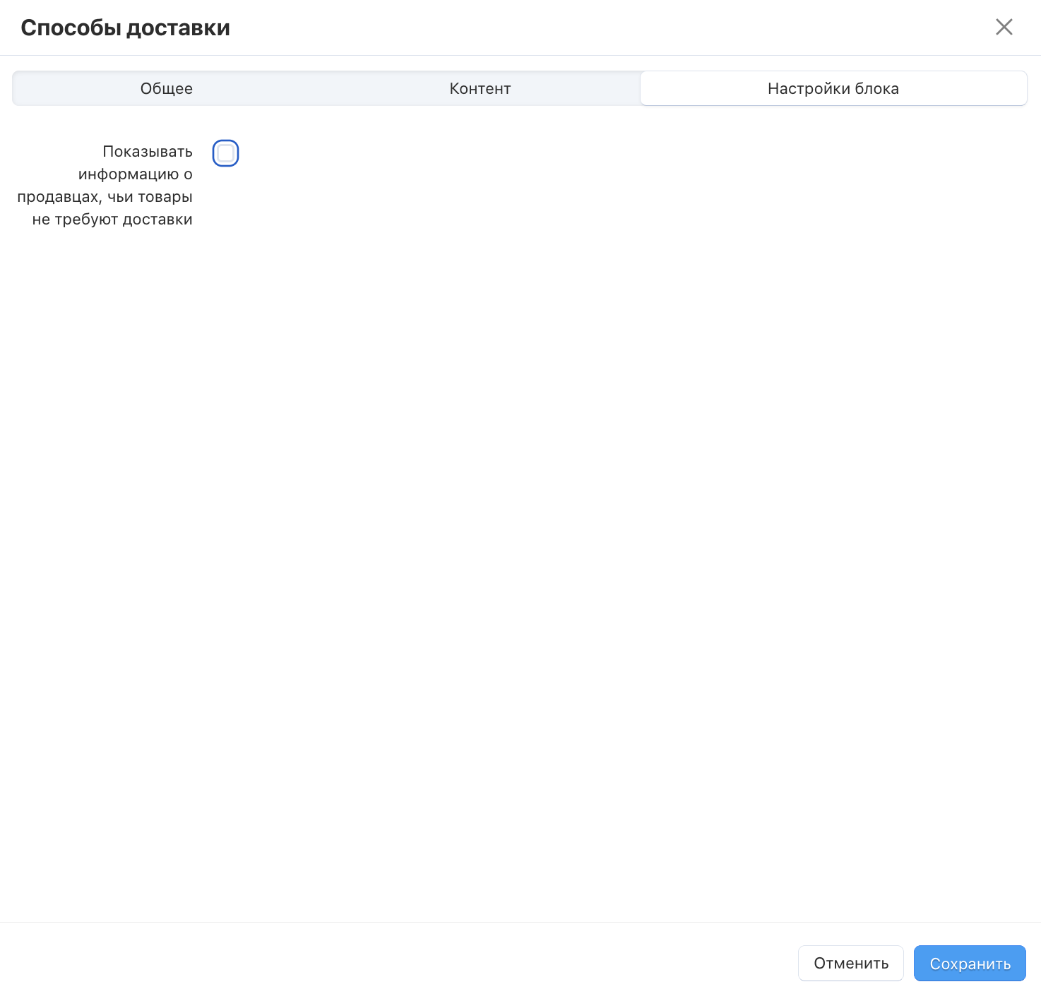 Если вы всё же хотите информировать покупателей об отсутствующей доставке, то поставьте галочку на вкладке Настройки блока в окне редактирования блока. А на вкладке Контент можно задать свой текст предупреждения, который покупатели увидят на странице оформления заказа при отсутствующей доставке.