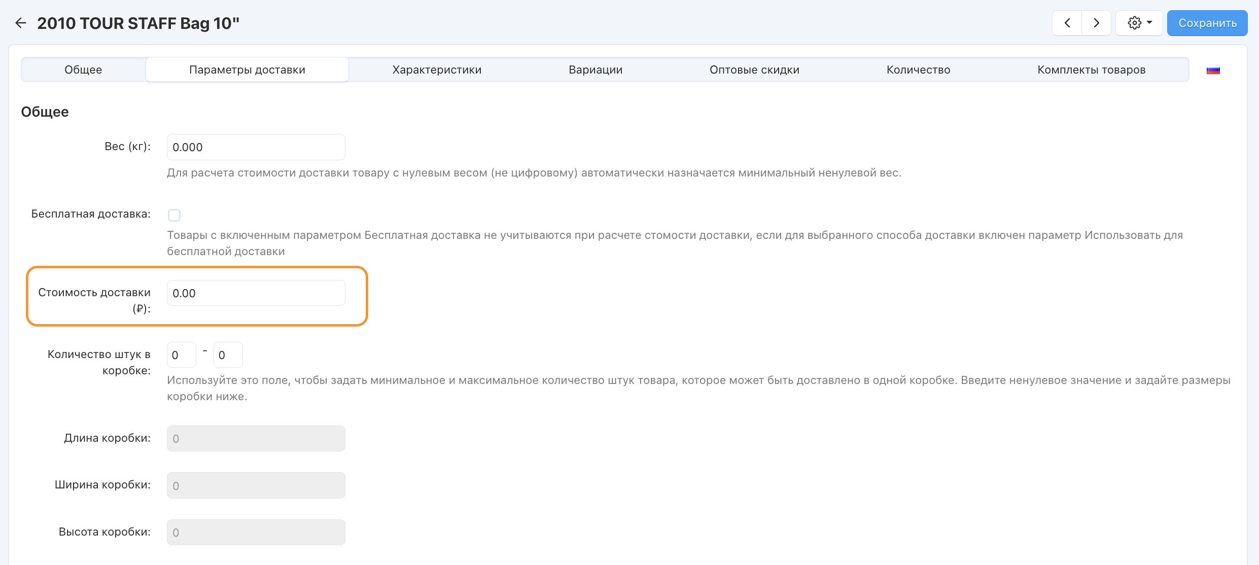 Откроется страница редактирования товара. Перейдите на вкладку Параметры доставки и проверьте значение поля Стоимость доставки. Если вы не хотите, чтобы за доставку этого товара бралась дополнительная сумма, оставьте это поле пустым или введите 0.