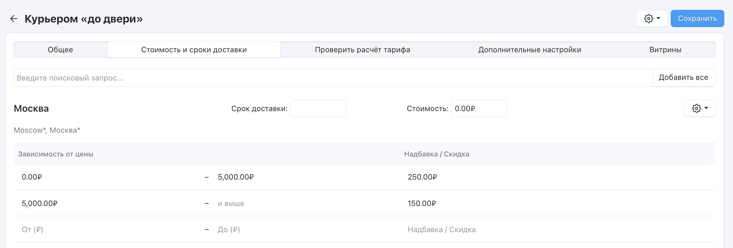 Откройте Настройки → Способы доставки и выберите нужный способ доставки. Перейдите на вкладку Стоимость и сроки доставки и убедитесь, что для тарифной зоны, выбранной покупателем, указаны тарифы на доставку.