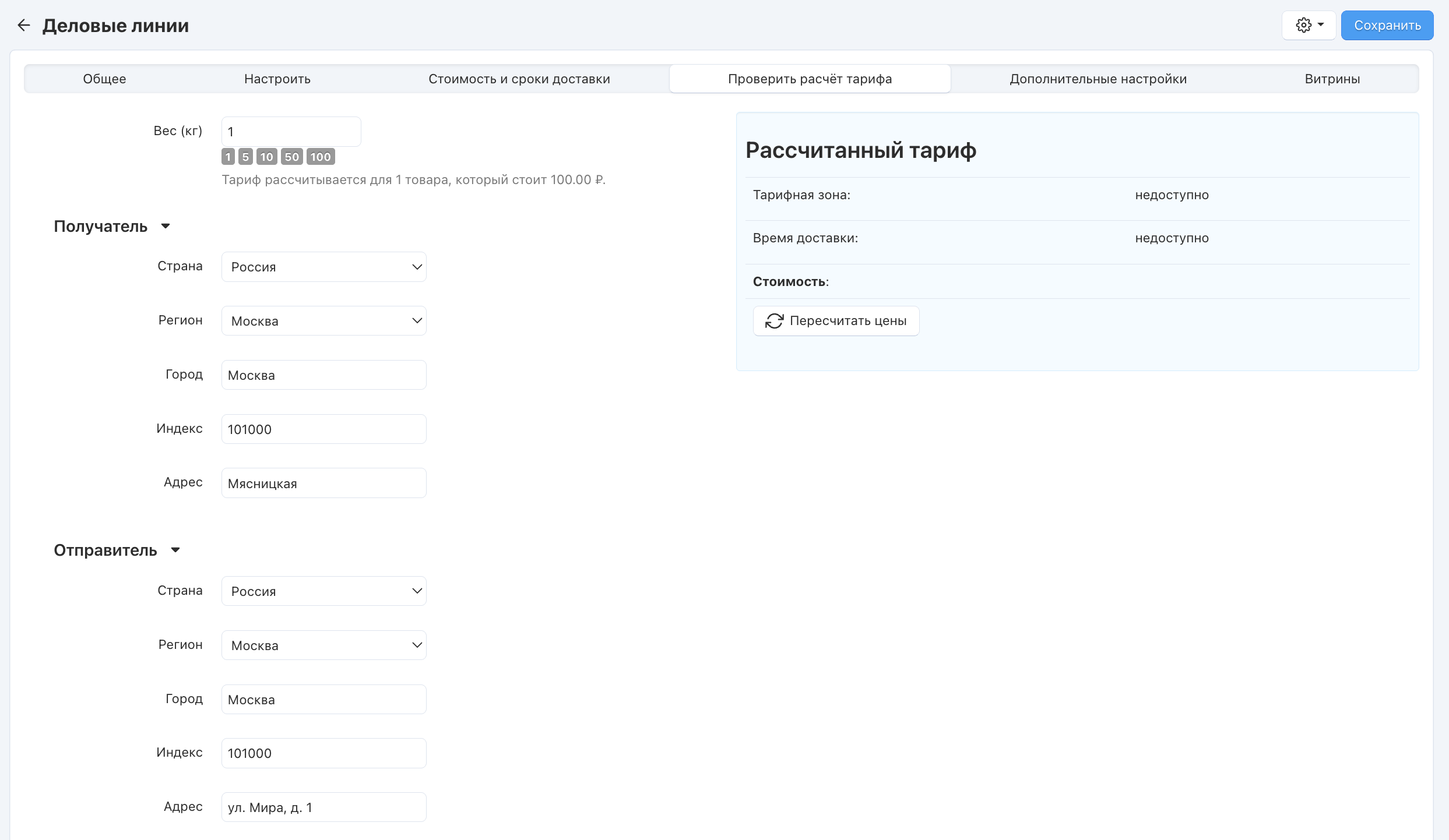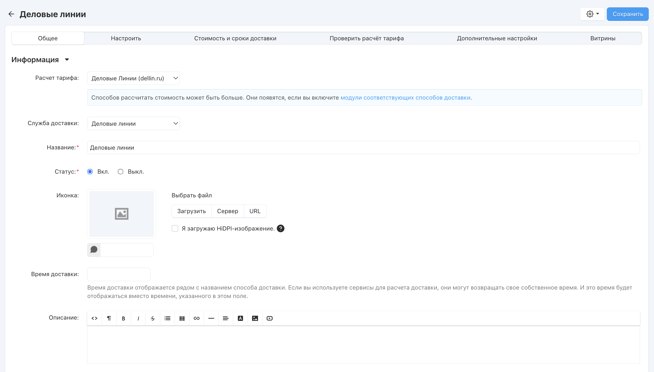 Создайте новый способ доставки с Расчетом тарифа Деловые линии.