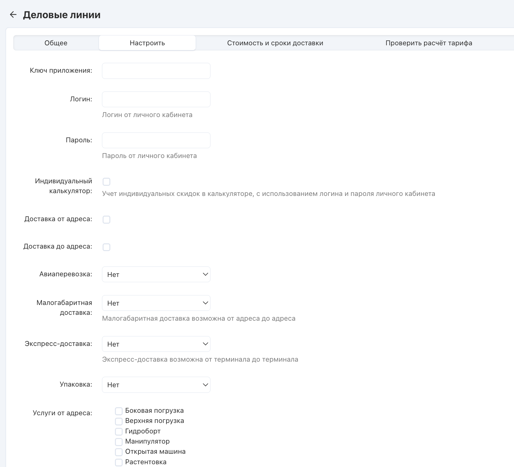 - Индивидуальный калькулятор ― учет индивидуальных скидок при расчете стоимости доставки. При использовании данной настройки необходимо обязательно заполнить поля “Логин” и “Пароль”.
